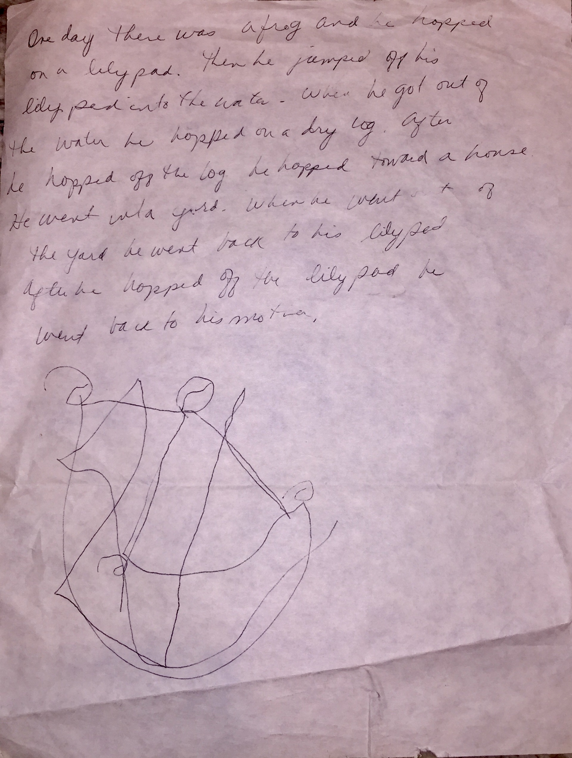The drawing at the bottom of the page, done by yours truly, seems to depict the circuitous path of the frogs incessant hopping from one object to another.